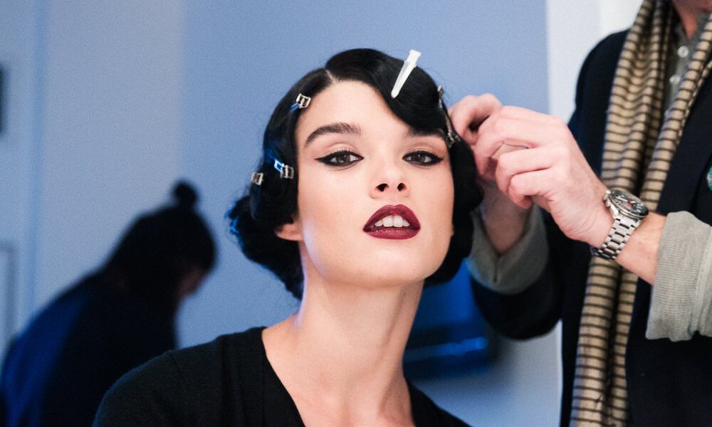 Tonight I’m going for a nice, soft wave in the front that will come down over my eyebrow and roll in on the back to create this faux-bob. All the products are Oribe, but I also have a lot of Redken in my own collection. First my hairstylist, Leonardo Manetti, used the Maximista Thickening Spray, then the Grandiose Hair Plumping Mousse before blowing it out for a super-shiny texture. And then he finished it off with the Soft Lacquer Heat Styling Hair Spraysince this is a really sculptural look. I use Oribe all the time, but I just jump from product to product. I like to use it very thoroughly, and once I’m done with that, I’ll jump to another company.